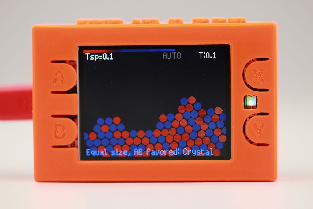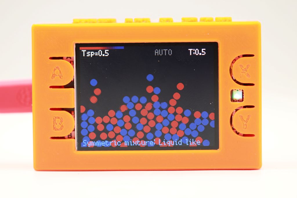Interactive 2D binary molecular dynamics simulation running on a Raspberry Pi Pico 2 with a colour display. Designed as a demonstration device for the RUC Physics Department — shows gas, liquid, and crystal phases; phase separation; and size-mismatch effects, all in real time on a handheld device.